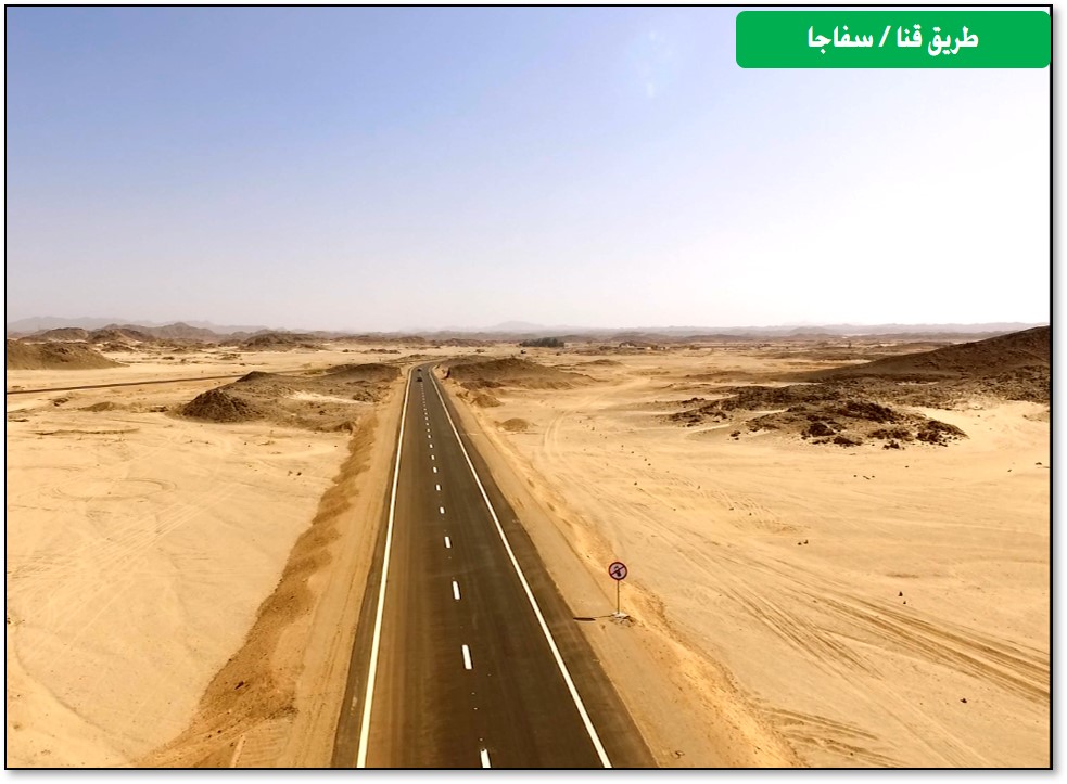 طريق أسوان/برنيس: بطول 275 كم وبعرض 7.5 متر. جارٍ رفع كفاءة مسافة 15 كم، وسيتم استكمال باقي الطريق ضمن الخطة السنوية للهيئة.