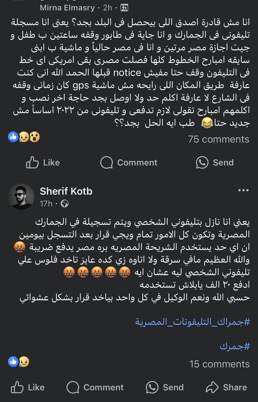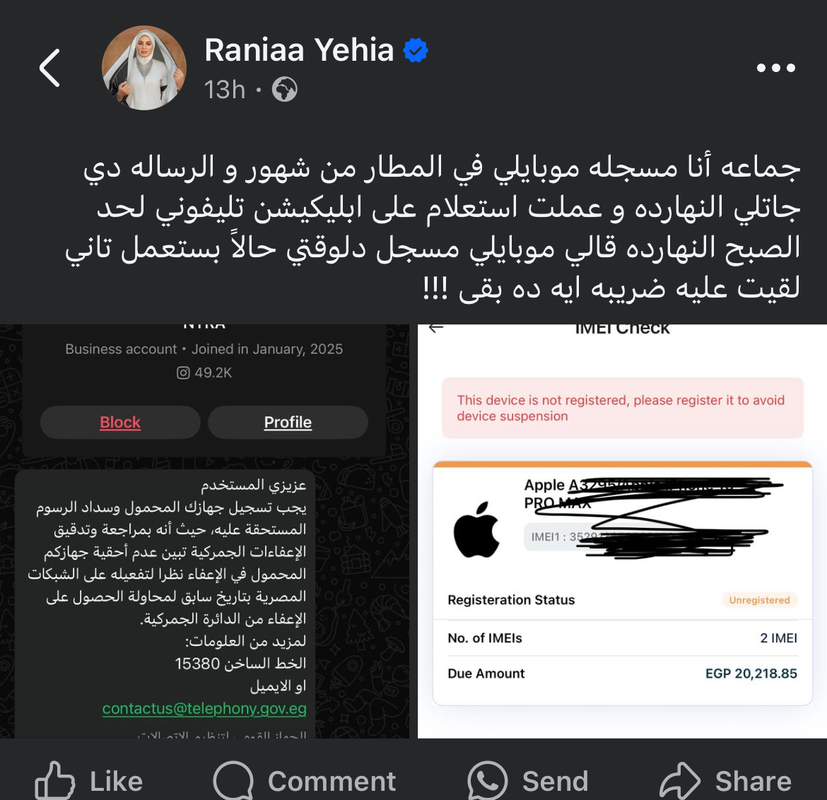 وقالت أسماء، إحدى المتضررات، إنها اشترت هاتفًا من السعودية وسجلته عند وصولها إلى مطار القاهرة، حيث أكد لها الموظف أنه لا توجد أي رسوم إضافية، لكن بعد يوم واحد فقط، تلقت رسالة من تفيد بوجوب دفع ضريبة وإلا سيتم غلق الهاتف خلال 90 يومًا.