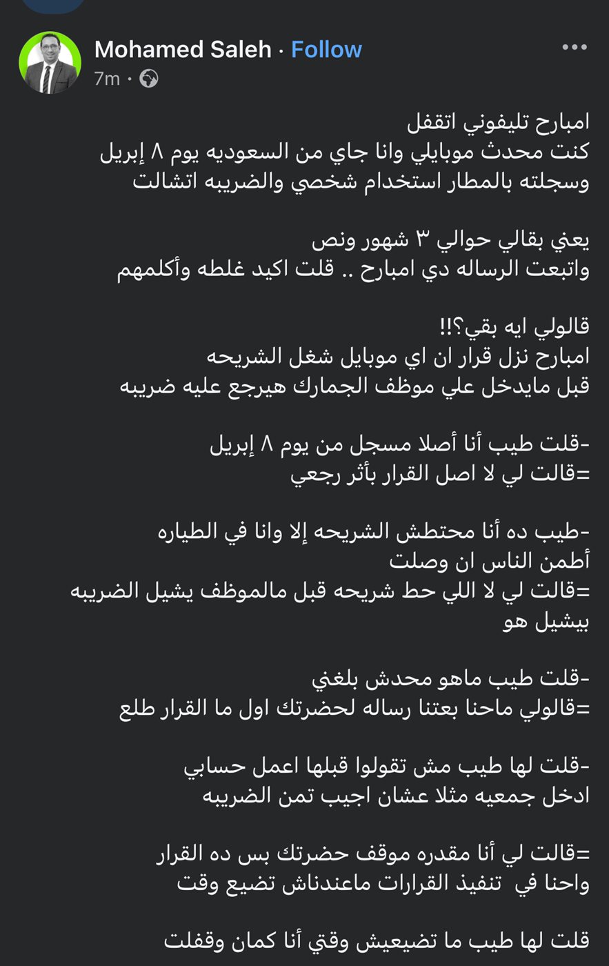 وفي بوست نشره الشاب الذي يدعى عبد الرحمن مصطفى عبر منصات التواصل الاجتماعي، قال الشاب إنه لا يمتلك هذا المبلغ أصلًا، وإنه اشترى الهاتف لغرض العمل، لا للترف أو التفاخر، مؤكدًا أن قانون الإعفاء الضريبي هو ما دفعه لاتخاذ هذه الخطوة.