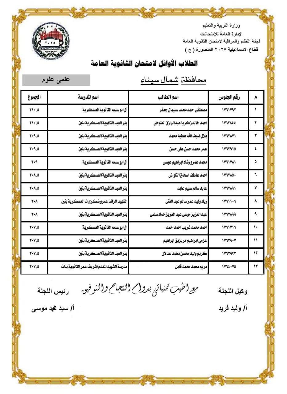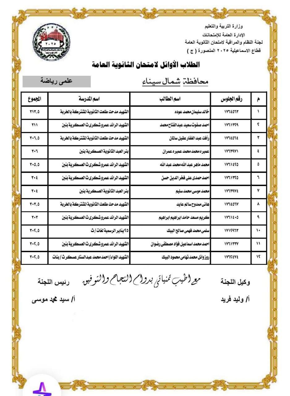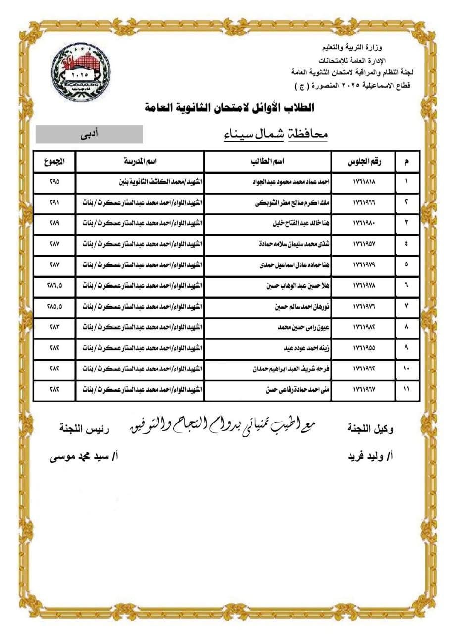 مديرية التربية والتعليم بشمال سيناء تعلن أسماء أوائل الثانوية العامة والمحافظ يهنئ المتفوقين