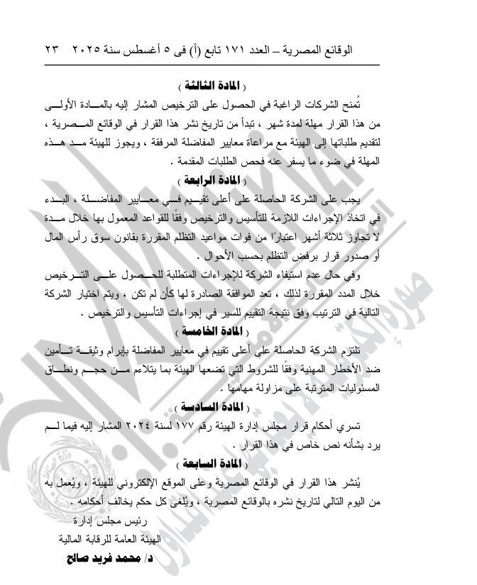 يُنشر هذا القرار في الوقائع المصرية وعلى الموقع الإلكتروني للهيئة، ويُعمل به اعتبارًا من اليوم التالي لتاريخ نشره. ويُلغي القرار أي أحكام سابقة تتعارض مع بنوده.