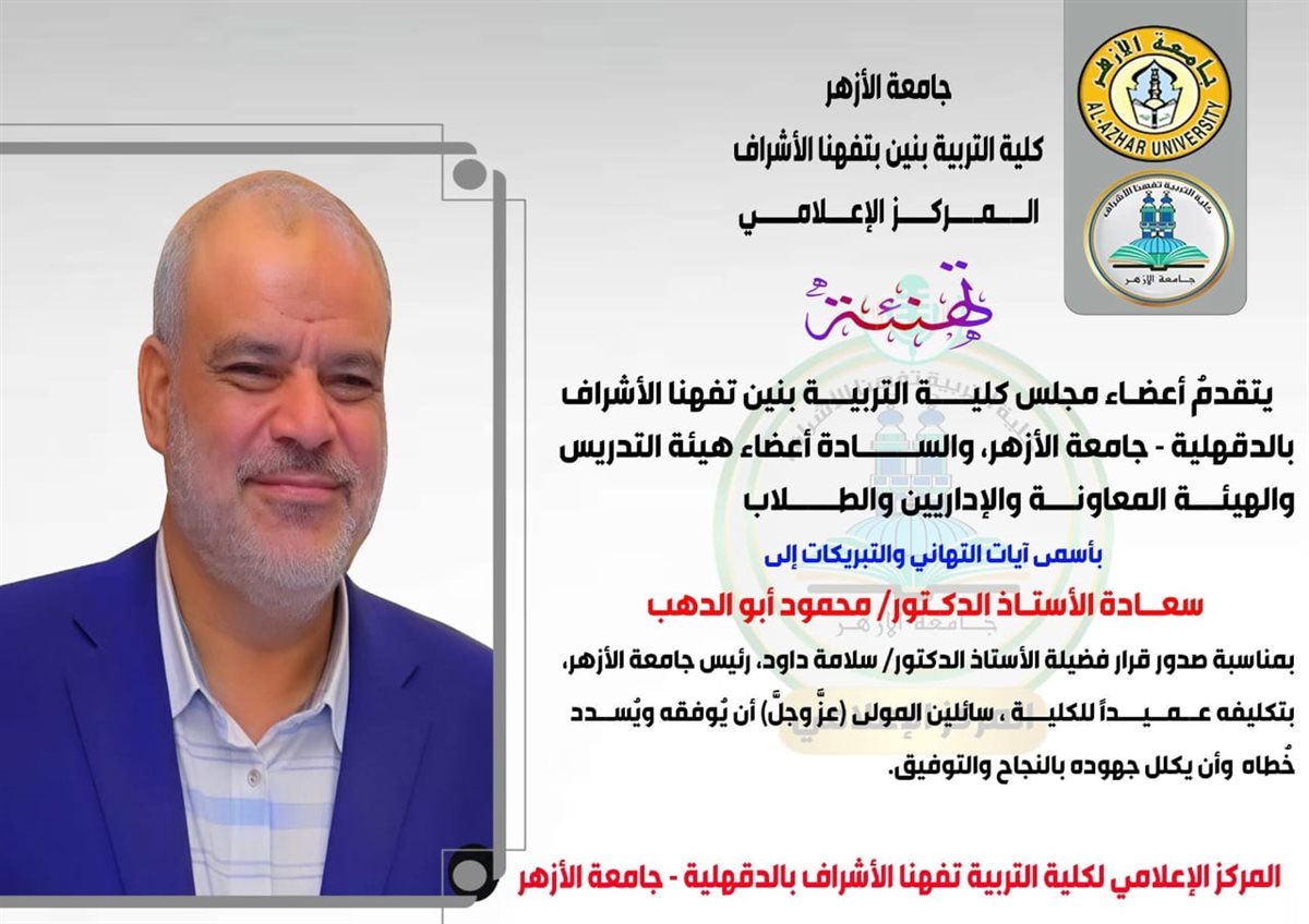 وبهذه المناسبة، تقدمت هيئة التدريس بكلية التربية بنين تفهنا الأشراف، وأعضاء الهيئة المعاونة، والإداريون، والطلاب، بخالص التهاني والتبريكات للدكتور أبو الدهب، سائلين المولى عز وجل أن يوفقه ويسدد خطاه، وأن يكلل جهوده بمزيد من النجاح والتوفيق في خدمة الكلية والجامعة.