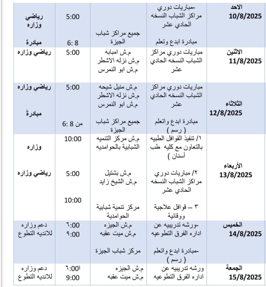 محافظة الجيزة: أنشطة وبرامج مراكز الشباب من 10 إلى 15 أغسطس 2025
