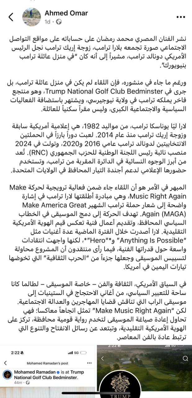 رمضان نشر الصورة عبر حسابه الرسمي على إنستجرام، وكتب: تشرفت أمس بدعوة لارا ترامب في منزل عائلة الرئيس الأمريكي دونالد ترامب في نيويورك واهتمامهم بي يعني اهتمامهم واحترامهم لقارتي وبلدي.. استعدوا لمفاجأة كبيرة قريبًا، ثقة في الله نجاح.