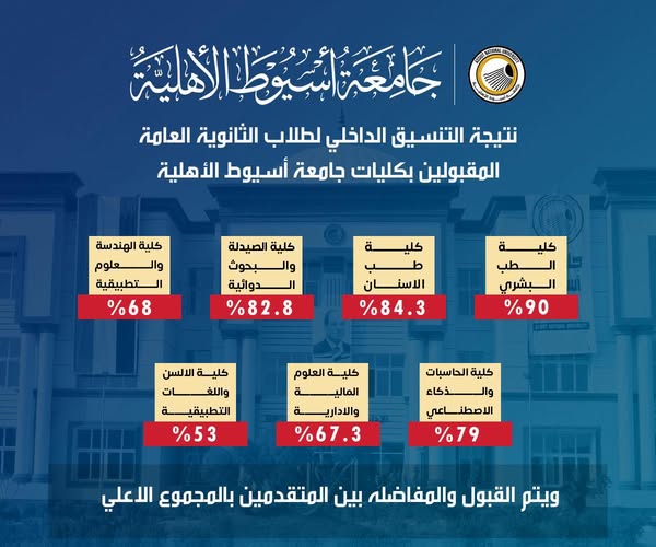 أعلنت جامعة أسيوط الأهلية، التنسيق الداخلي لطلاب شهادة الثانوية العامة المصرية 2025 بكليات جامعة أسيوط الأهلية والتي جاءت كالتالي: