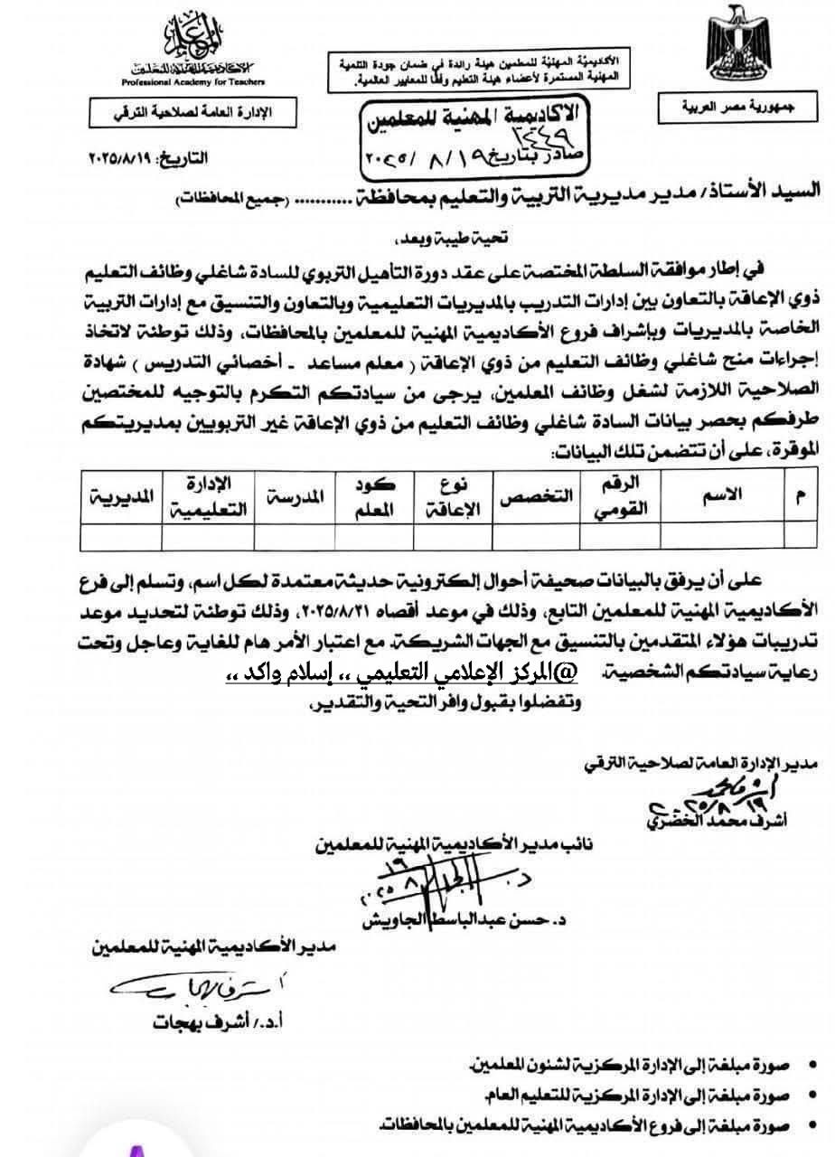 وقالت الأكاديمية المهنية، في خطابها، إنه في إطار موافقة السلطة المختصة على عقد دورة التأهيل التربوي لشاغلي وظائف التعليم ذوي الإعاقة بالتعاون بين إدارات التدريب بالمديريات التعليمية وبالتعاون والتنسيق مع إدارات التربية الخاصة بالمديريات وبإشراف فروع الاكاديمية المهنية للمعلمين بالمحافظات، لاتخاذ إجراءات منح شاغلي وظائف التعليم من ذوي الإعاقة ( معلم مساعد - اخصائي التدريس) شهادة الصلاحية اللازمة لشغل وظائف المعلمين، يرجى حصر بيانات شاغلي وظائف التعليم من ذوي الإعاقة غير التربويين بمديريات التربية والتعليم متضمنة (الاسم - الرقم القومي - التخصص - نوع الإعاقة - المدرسة - الإدارة التعليمية - المديرية).