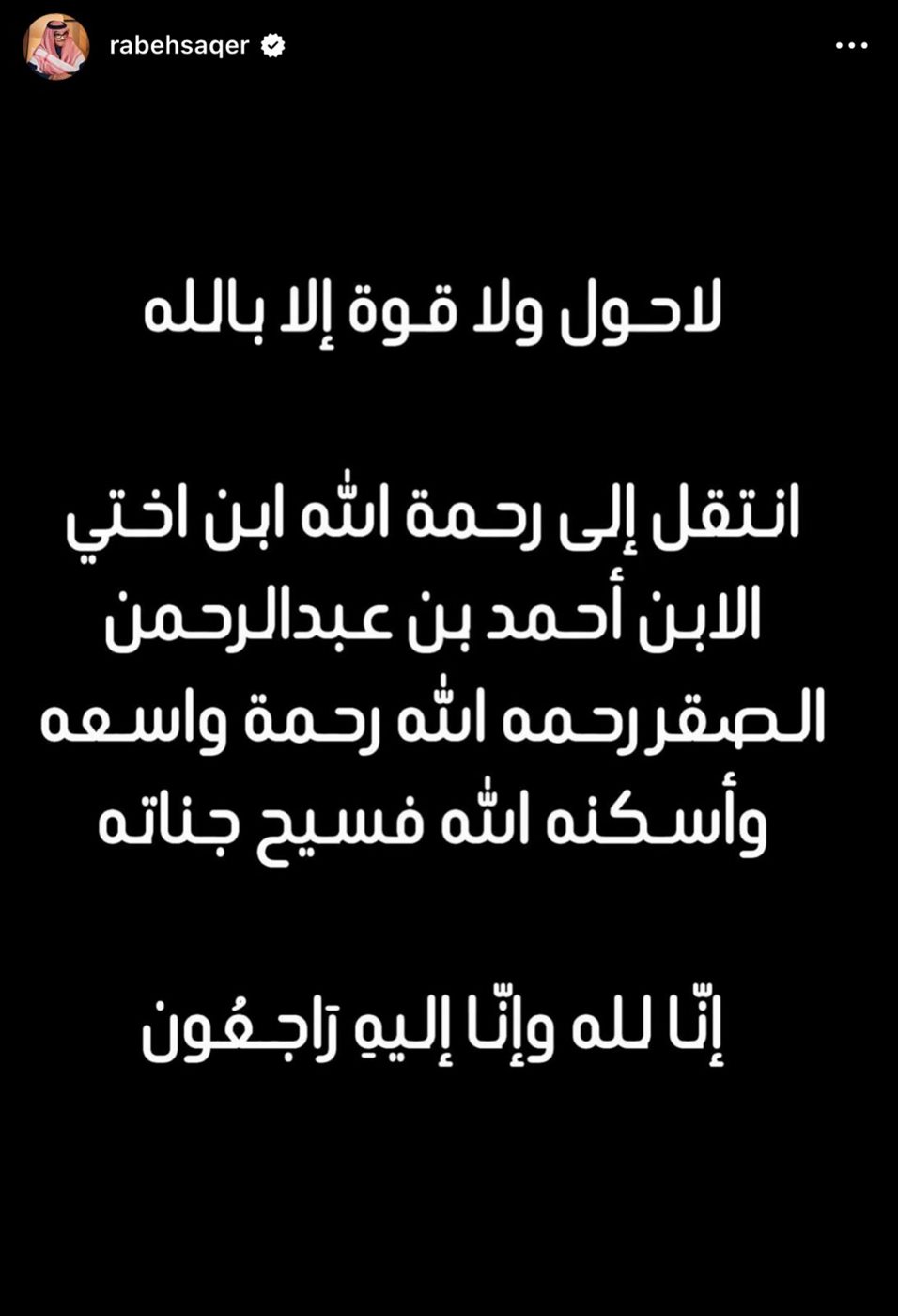رحل عن عالمنا نجل شقيقة الفنان السعودي رابح صقر، في خبر أحزن أسرته ومحبيه.