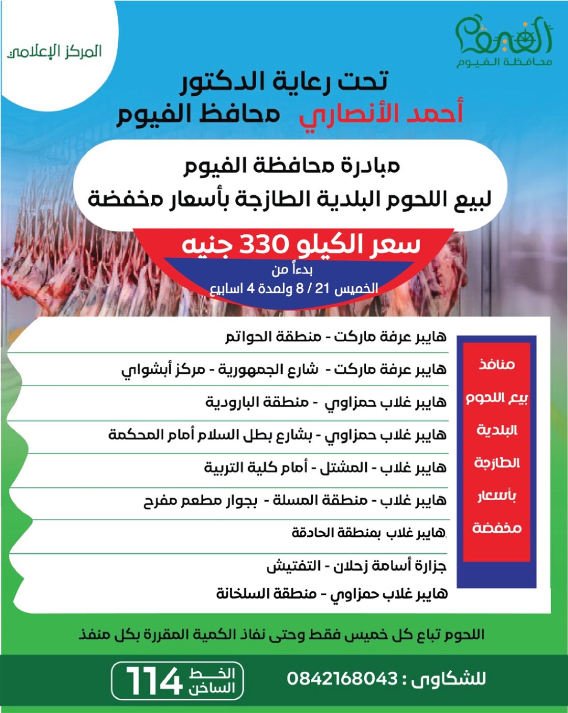 أماكن منافذ بيع اللحوم بأسعار مخفضة في الفيوم