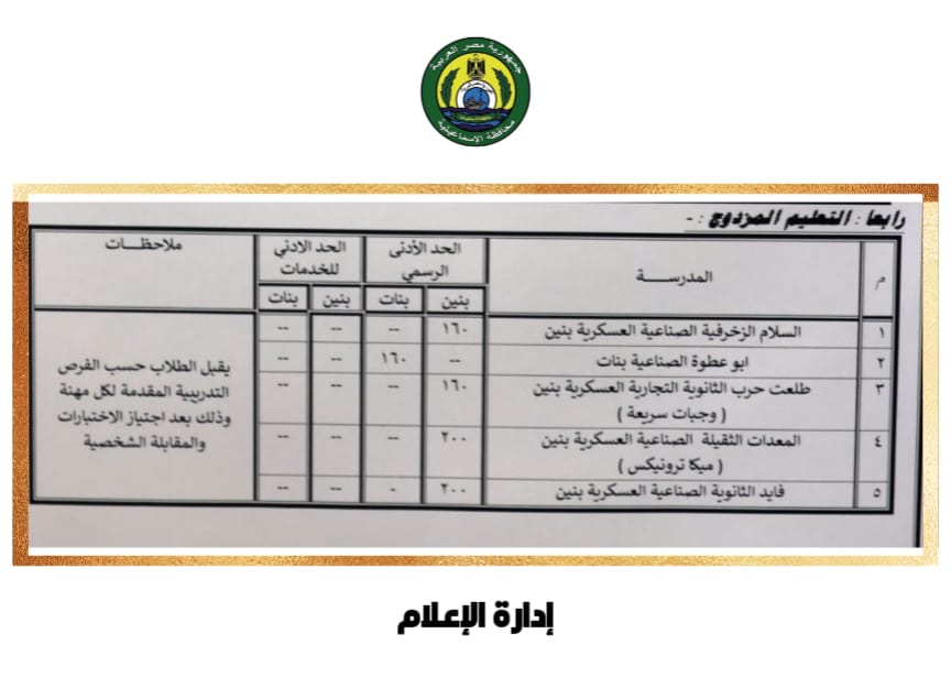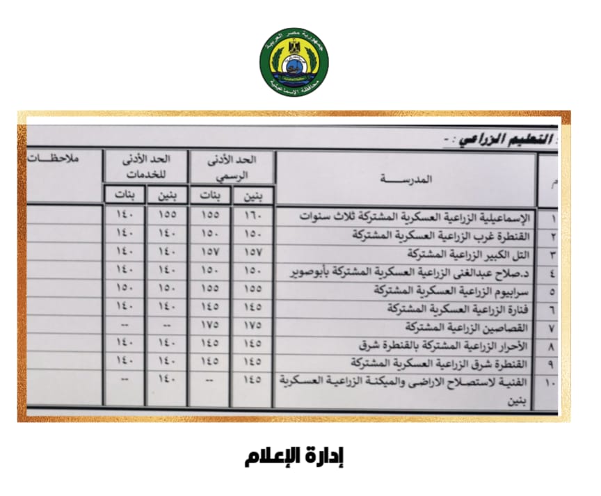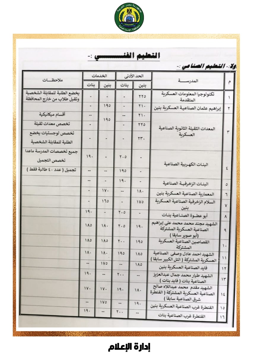 وأشار وكيل الوزارة إلى أنه تم كذلك اعتماد الحدود الدنيا للقبول بالمدارس الثانوية الفنية الصناعية والتجارية والزراعية وفصول الخدمات، وذلك بعد دراسة الإحصاء التكراري للطلاب الناجحين في الدور الثاني، بما يضمن استيعاب جميع الطلاب وفقًا للطاقة الاستيعابية المتاحة بالمدارس.