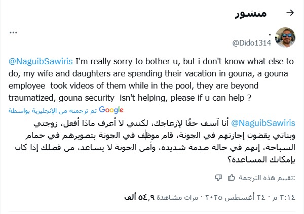 وكتب أحد الأشخاص يدعى في منشور عبر حسابه بمنصة إكس: أنا آسف حقًا لإزعاجك، لكنني لا أعرف ماذا أفعل، زوجتي وبناتي يقضون إجازتهم في الجونة، قام موظف في الجونة بتصويرهم في حمام السباحة، إنهم في حالة صدمة شديدة، وأمن الجونة لا يساعد، من فضلك إذا كان بإمكانك المساعدة؟.