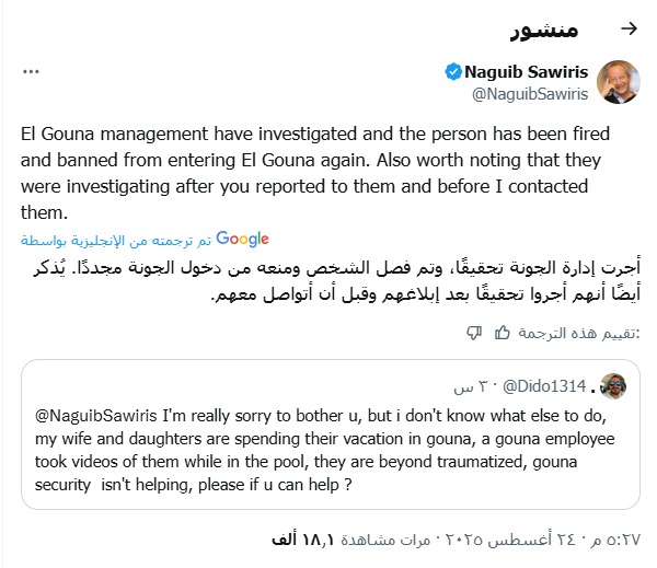 وبدوره علق نجيب ساويرس على المنشور قائلا: أجرت إدارة الجونة تحقيقًا، وتم فصل الشخص ومنعه من دخول الجونة مجددًا، يُذكر أيضًا أنهم أجروا تحقيقًا بعد إبلاغهم وقبل أن أتواصل معهم.