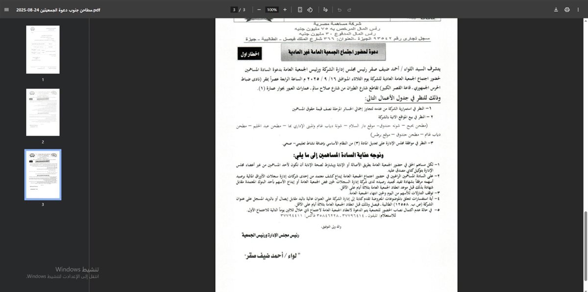 ودعا اللواء أحمد ضيف صقر رئيس مجلس إدارة شركة مطاحن ومخابز جنوب القاهرة والجيزة، المساهمين لحضور الجمعية العامة يوم 16-9-2025، للنظر في استمرار الشركة من عدمه لتجاوز الخسائر المرحلة نصف قيمة حقوق المساهمين.