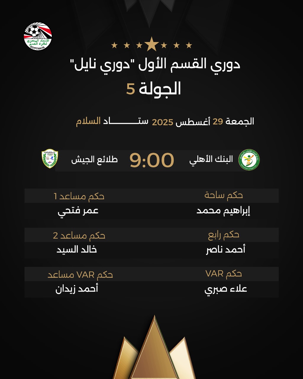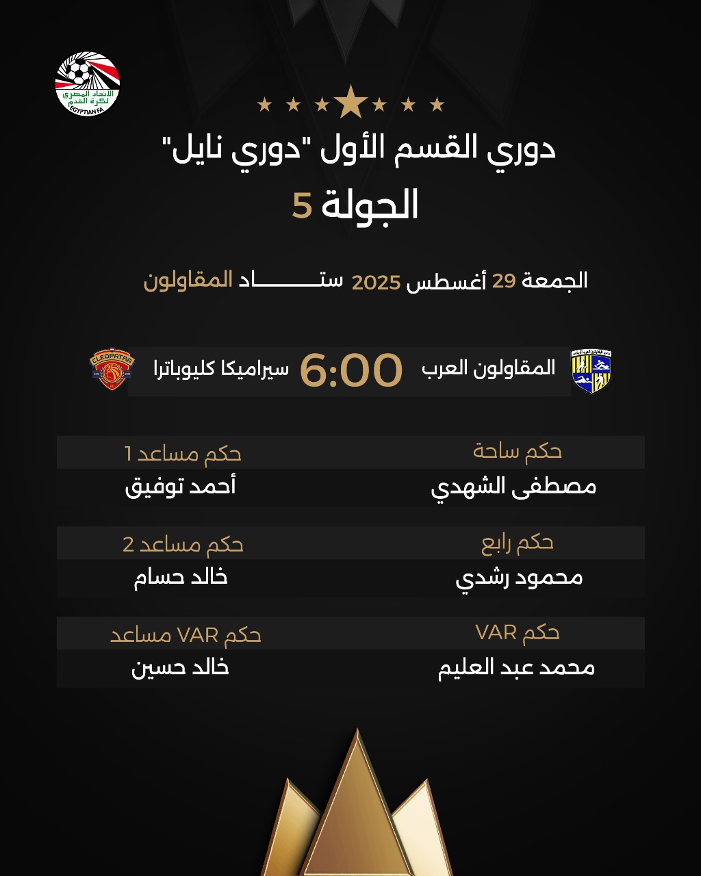 كشف الاتحاد المصري لكرة القدم طاقم حكام مباريات الجمعة، من مسابقة الدوري المصري الممتاز لموسم 2025-2026.