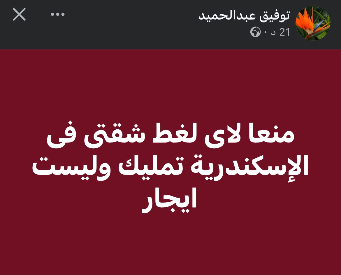 وكتب توفيق عبد الحميد منشورا، عبر حسابه الشخصي بموقع التواصل الاجتماعي فيس بوك، قال فيه: منعا لأي لغط شقتي في الإسكندرية تمليك وليست إيجار.