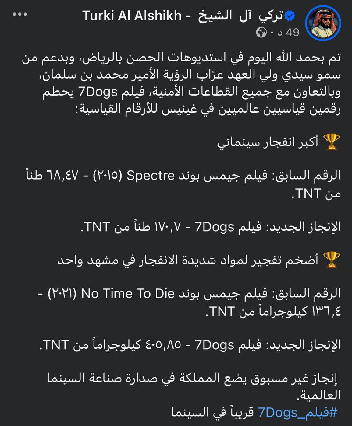وكتب تركي ال الشيخ منشورا، عبر حسابه الشخصي بفيس بوك، قال فيه: تم بحمد الله اليوم في استديوهات الحصن بالرياض، وبدعم من سمو سيدي ولي العهد عرّاب الرؤية الأمير محمد بن سلمان، وبالتعاون مع جميع القطاعات الأمنية، فيلم 7Dogs يحطم رقمين قياسيين عالميين في جينيس للأرقام القياسية وهما: أكبر انفجار سينمائي.. الرقم السابق كان فيلم جيمس بوند Spectre (٢٠١٥) - ٦٨٫٤٧ طنًا من TNT.