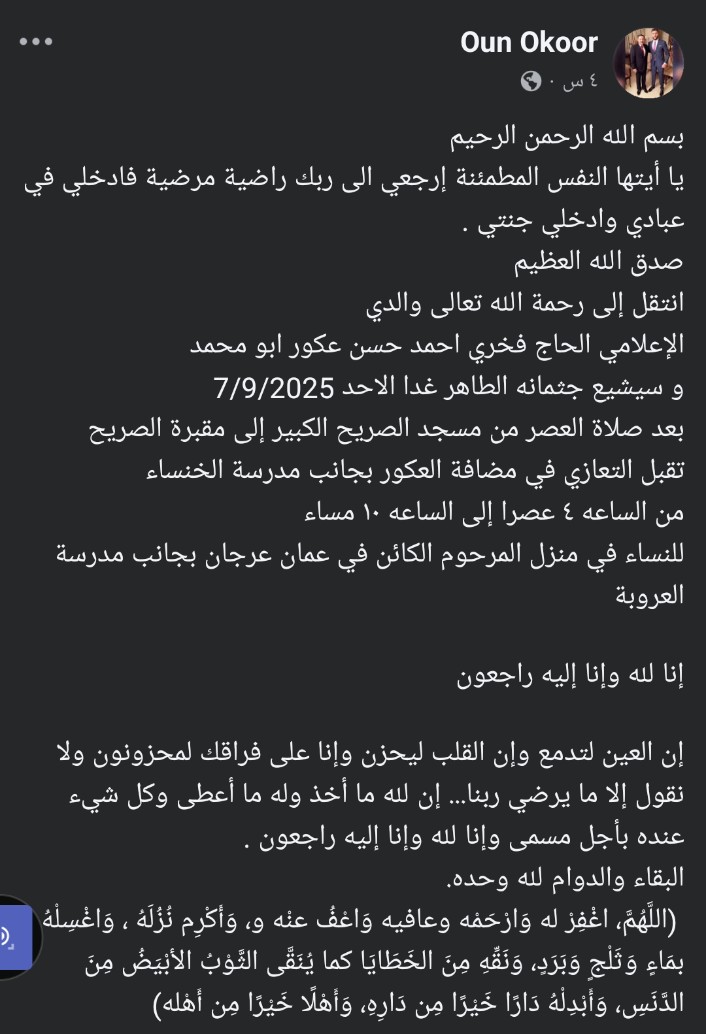 تقبل التعازي في مضافة العكور بجانب مدرسة الخنساء من الساعة 4 عصرا إلى الساعه 10 مساء، وللنساء في منزل المرحوم الكائن في عمان عرجان بجانب مدرسة العروبة.. إنا لله وإنا إليه راجعون، إن العين لتدمع وإن القلب ليحزن وإنا على فراقك لمحزونون ولا نقول إلا ما يرضي ربنا، إن لله ما أخذ وله ما أعطى وكل شيء عنده بأجل مسمى وإنا لله وإنا إليه راجعون البقاء والدوام لله وحده.