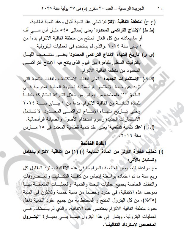 وفقًا للمادة الأولى من القانون، تُحدد "منطقة اتفاقية الالتزام" كأول وعقد تنمية قطاعية. وتوضح المادة الثانية أن "الإنتاج التراكمي المحدود" يبلغ إجماليه 450 مليار قدم مكعب أو ما يعادله من الغاز المنتج في المنطقة، بدءًا من 1 يناير 2024، ولا يستخدم في العمليات البترولية.