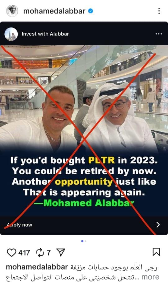 حذر محمد العبار، رجل الأعمال الإماراتي ومؤسس شركة إعمار العقارية، عبر صفحته الرسمية على إنستجرام، من انتشار حسابات مزيفة تنتحل شخصيته وتروج لمشروعات استثمارية باسمه، مؤكدًا ضرورة توخي الحذر وعدم التعامل مع هذه الحسابات أو تحويل أي مبالغ مالية إلى جهات غير معروفة.