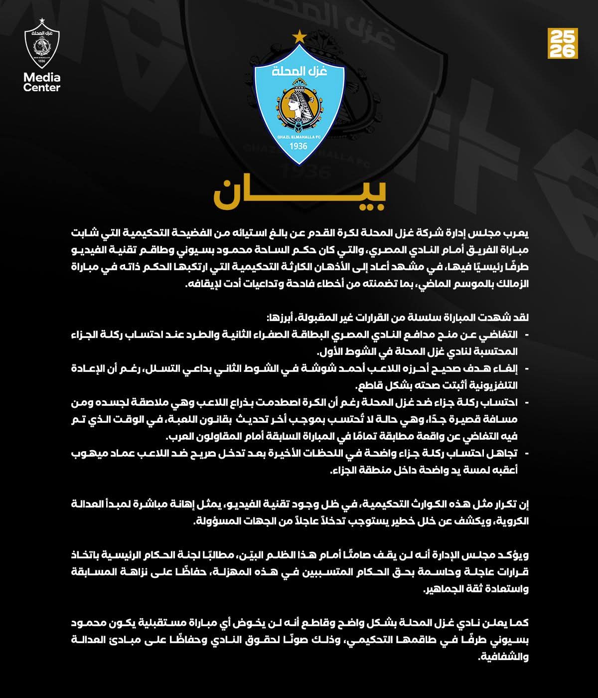 أصدر مجلس إدارة شركة غزل المحلة لكرة القدم بيانًا عبّر فيه عن استيائه من القرارات التحكيمية التي شهدتها مباراة الفريق أمام النادي المصري البورسعيدي، والتي كانت تحت إشراف مجموعة من الحكام الذين ظهروا في أكثر من مناسبة بتقنيات تحكيمية لا تتناسب مع معايير التحكيم الدولية، مما أدى إلى احتساب بعض الأخطاء التحكيمية التي أثرت في سير المباراة والنتيجة النهائية لها.