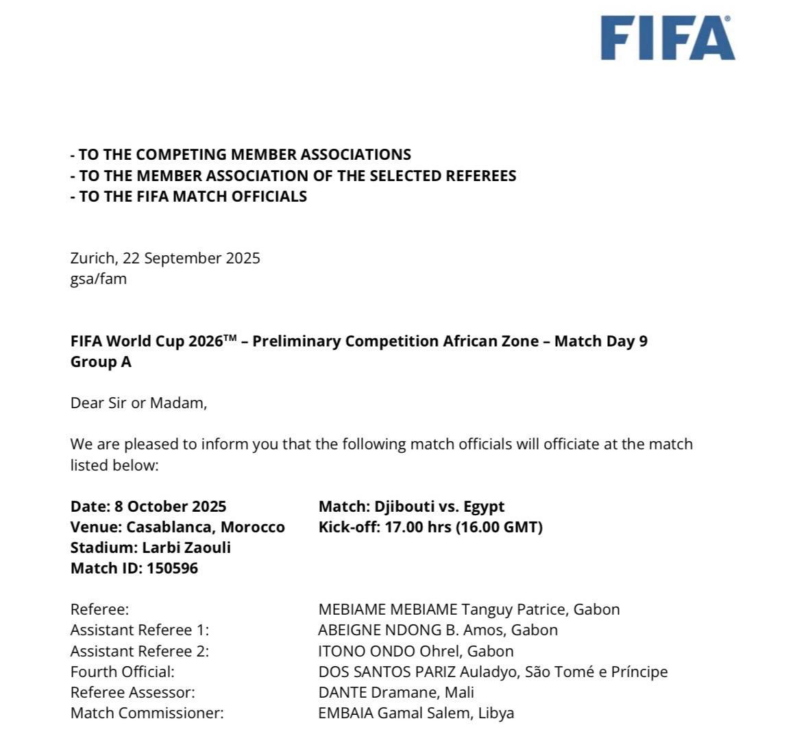 فيفا يعلن رسميًا موعد وطاقم حكام مباراة مصر وجيبوتي في تصفيات كأس العالم 2026