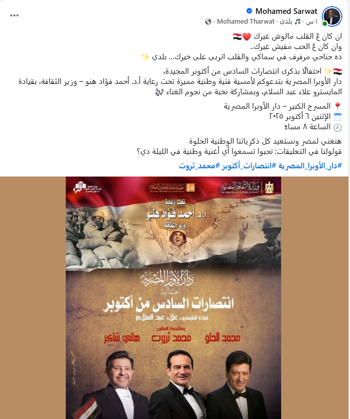 وكتب محمد ثروت منشورا، عبر حسابه الشخصي بموقع التواصل الاجتماعي فيس بوك، قائلًا: إن كان على القلب مالوش غيرك، وإن كان على الحب مفيش غيرك، ده جناحي مرفرف في سماكي والقلب أتربى على خيرك، احتفالًا بذكرى انتصارات السادس من أكتوبر المجيدة، دار الأوبرا المصرية بتدعوكم لأمسية فنية وطنية مميزة تحت رعاية الدكتور أحمد فؤاد هنو وزير الثقافة، بقيادة المايسترو علاء عبد السلام، وبمشاركة نخبة من نجوم الغناء، المسرح الكبير دار الأوبرا المصرية، هنغني لمصر ونستعيد كل ذكرياتنا الوطنية الحلوة.