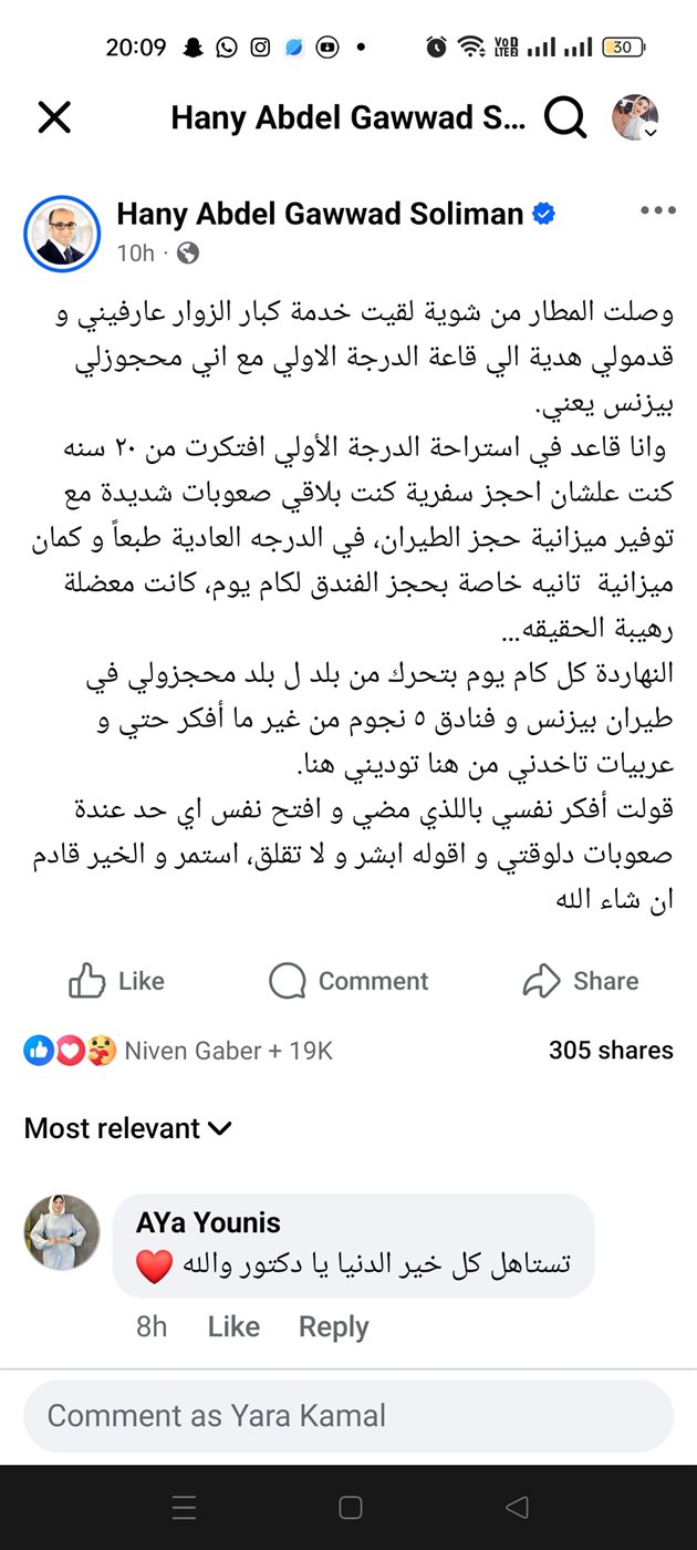 وكتب الدكتور هاني عبد الجواد منشورًا عبر صفحته الرسمية على موقع التواصل الاجتماعي جاء فيه: وصلت المطار من شوية لقيت خدمة كبار الزوار عارفيني وقدمولي هدية إلى قاعة الدرجة الأولى مع إني محجوزلي بيزنس يعني.