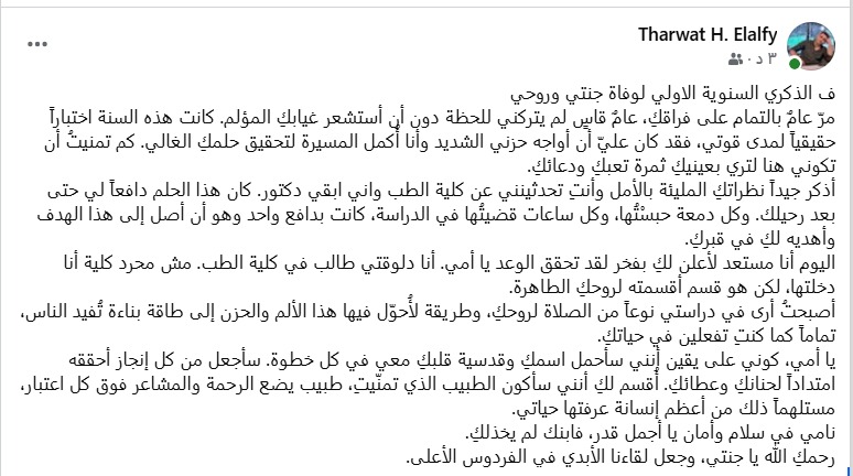 وقال طالب الطب ثروت هيكل في منشور مؤثر عبر حسابه بموقع فيسبوك، متذكر والدته في الذكرى الأولى لرحيلها: "في الذكرى السنوية الأولى لوفاة جنتي وروحي.. مر عام بالتمام على فراقك، عام قاس لم يتركني للحظة دون أن أستشعر غيابك المؤلم".