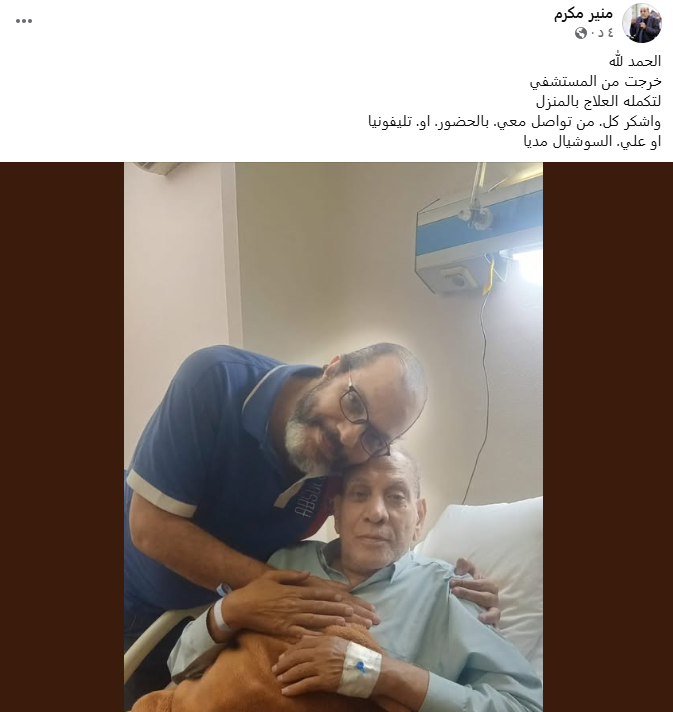 وكتب منير مكرم منشورا، عبر حسابه الشخصي بموقع التواصل الاجتماعي فيس بوك، قال فيه: الحمد لله خرجت من المستشفى لتكمله العلاج بالمنزل، وأشكر كل من تواصل معي بالحضور أو تليفونيًا أو على السوشيال ميديا.