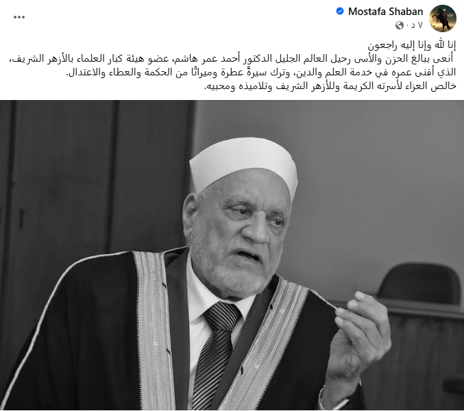وكتب مصطفى شعبان منشورا، عبر حسابه الشخصي بموقع التواصل الاجتماعي فيس بوك، قال فيه: إنا لله وإنا إليه راجعون، أنعى ببالغ الحزن والأسى رحيل العالم الجليل الدكتور أحمد عمر هاشم، عضو هيئة كبار العلماء بالأزهر الشريف، الذي أفنى عمره في خدمة العلم والدين، وترك سيرةً عطرة وميراثًا من الحكمة والعطاء والاعتدال.. خالص العزاء لأسرته الكريمة وللأزهر الشريف وتلاميذه ومحبيه.