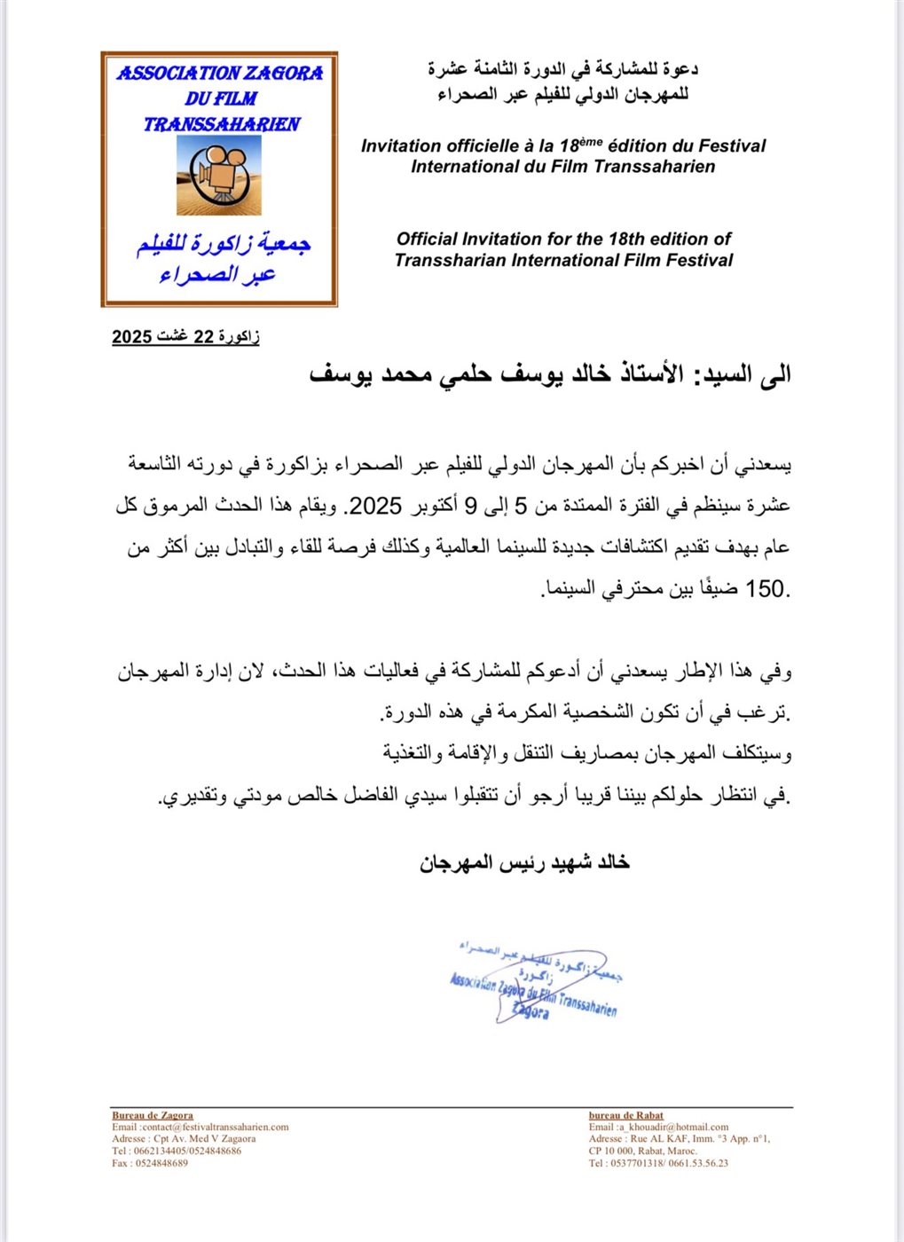 وعلق المخرج خالد يوسف على هذا التكريم، من خلال منشورا له عبر حسابه الشخصي بموقع التواصل الاجتماعي فيس بوك، قال فيه: في القلب محبة لك يا مغرب، جاءتني دعوة عزيزة على قلبي من المهرجان الدولي للفيلم المقام في مدينة زاكورة، الرابضة وراء جبال الأطلسي التي انتشرت فيها أقوى أسود العالم، ومن هنا جاءت تسمية فريق المغرب بأسود الأطلسي، أن اختياري الشخصية المكرمة لهذه الدورة لهو شرف كبير لي، خاصة أنه يجيء من هذه البلاد التي فتحت الأندلس، وبقيت هناك أكثر من 7 قرون، تنشر قيم الإسلام الحنيف في أوروبا، وترفع مشعل الحضارة العربية ليصل للعالم كله.