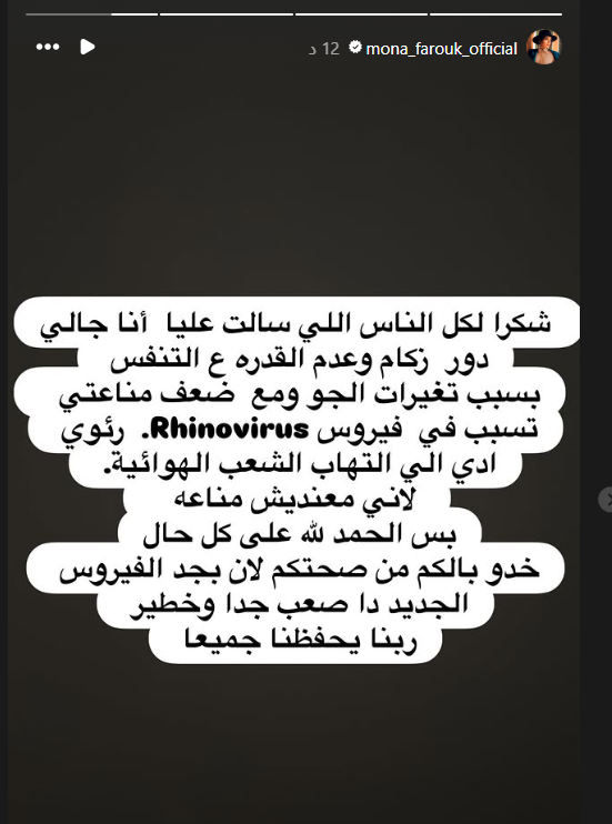 وقالت منى فاروق في منشور عبر حسابها الشخصي بموقع إنستجرام: جالي دور برد وزكام شديد، ومع تغيرات الجو وضعف مناعتي، حصلتلي مشاكل في التنفس، واتحول الموضوع لفيروس رئوي عملي التهاب في الشعب الهوائية، بس الحمد لله على كل حال.