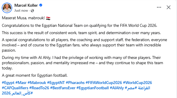 وقال كولر في رسالته: تهانينا للمنتخب المصري على تأهله لكأس العالم 2026. هذا النجاح ثمرة عمل دؤوب وروح الفريق الواحد وعزيمة على مدار سنوات طويلة. تهنئة خاصة لجميع اللاعبين، وللجهاز الفني والجهاز الفني المساعد، وللاتحاد، ولكل من ساهم في هذا النجاح، وبالطبع للجماهير المصرية التي تشجع فريقها دائمًا بشغف كبير.