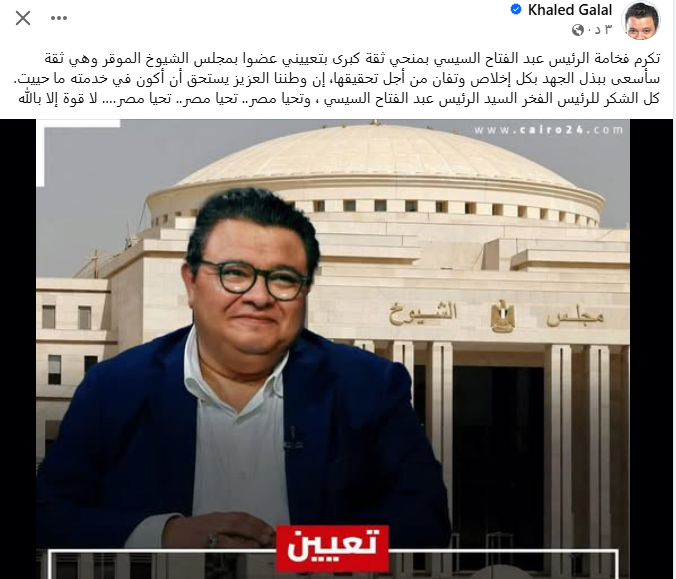 وكتب خالد جلال منشورا عبر حسابه الشخصي بموقع التواصل الاجتماعي فيس بوك، جاء فيه: تكرم الرئيس السيسي بمنحي ثقة كبرى بتعييني عضوًا بمجلس الشيوخ، ثقة سأسعى ببذل الجهد بكل إخلاص وتفان من أجل تحقيقها، إن وطننا العزيز يستحق أن أكون في خدمته ما حييت، كل الشكر للرئيس وتحيا مصر.. تحيا مصر.. تحيا مصر لا قوة إلا بالله.