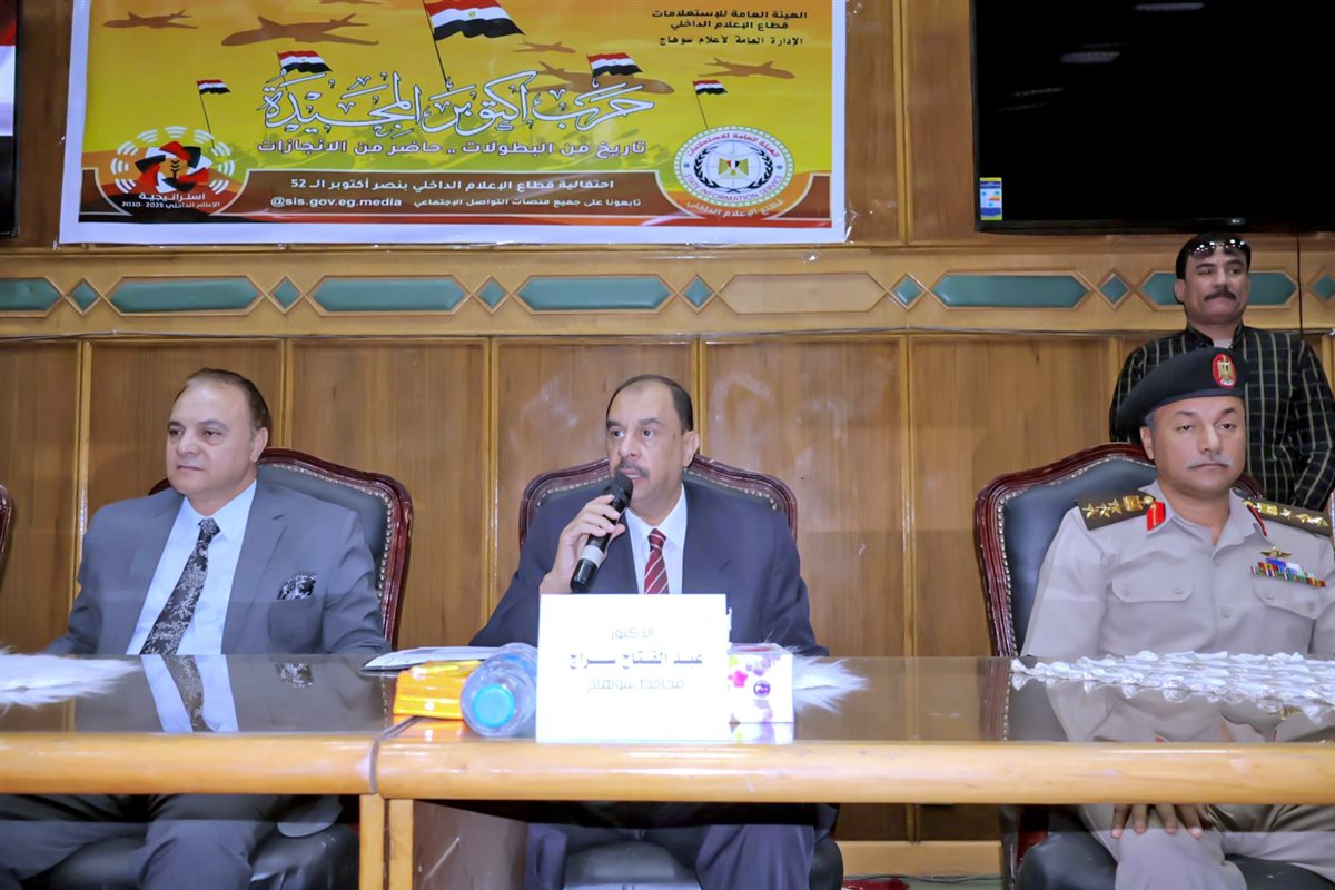 شهد اللواء عبد الفتاح سراج محافظ سوهاج، احتفالية قطاع الإعلام الداخلي بالهيئة العامة للاستعلامات بذكرى انتصارات أكتوبر المجيدة، والتي أقيمت تحت عنوان "تاريخ من البطولات.. حاضر من الإنجازات"، وذلك بمقر مجمع الإعلام النموذجي بسوهاج.
