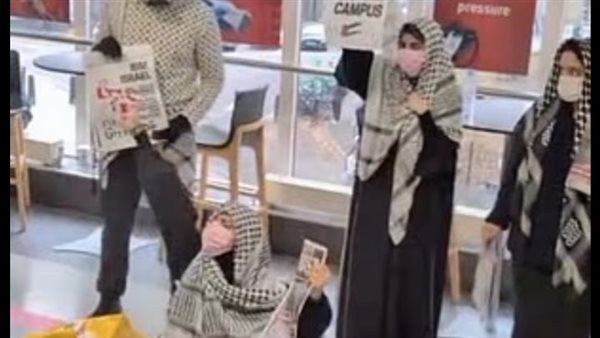 وأظهرت مقاطع مصوّرة المتظاهرين وهم يسيرون في ممرات الجامعة مرتدين الكوفيات ويرددون هتافات تطالب بفصله، فيما رفع آخرون لافتات تحمل صورته على خلفية ملوثة بالدماء وعبارات مثل العار على جامعة سيتي.
