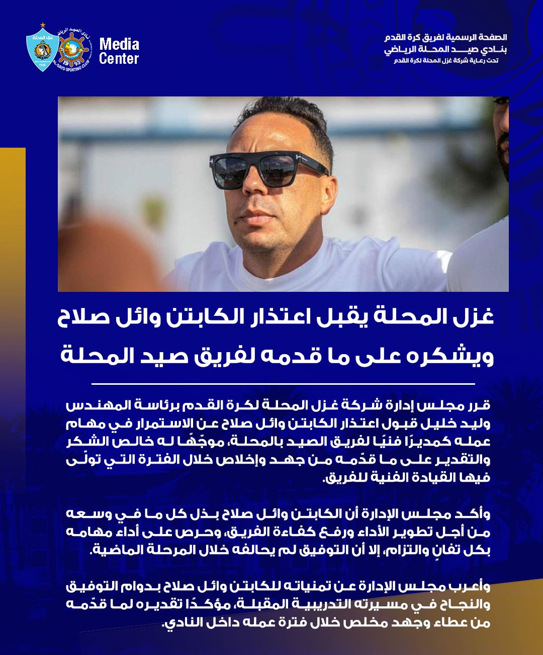 قرر مجلس إدارة شركة غزل المحلة لكرة القدم، برئاسة المهندس وليد خليل، قبول اعتذار وائل صلاح عن الاستمرار في مهام عمله كمدير فني لفريق الصيد بالمحلة، موجّهًا له خالص الشكر والتقدير على ما قدّمه من جهد وإخلاص خلال الفترة التي تولّى فيها القيادة الفنية للفريق.