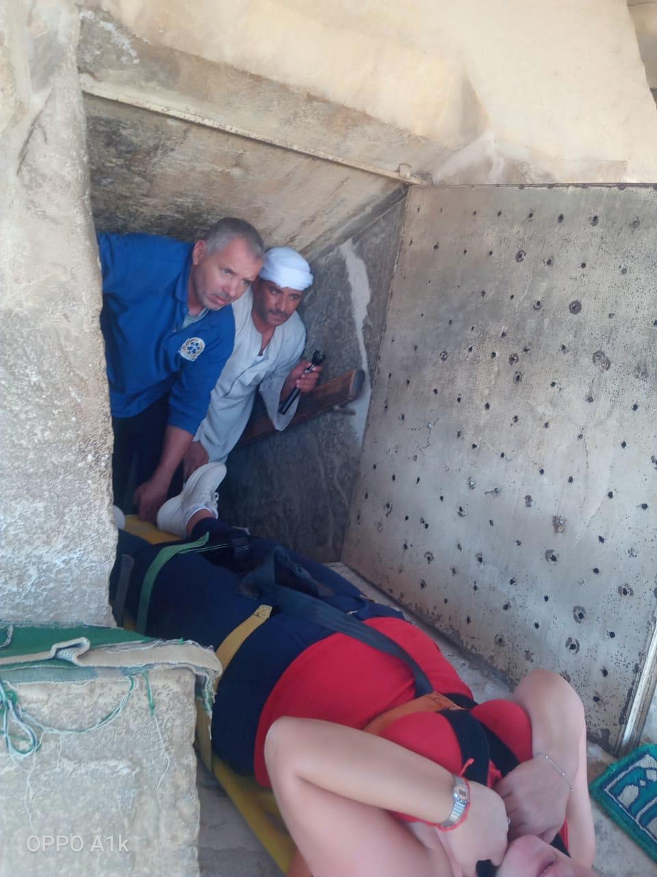 وأضاف عبد الغفار أن السائحة انزلقت على منحدر خشبي شديد الانحدار داخل أحد الممرات الضيقة بالهرم، مما أسفر عن اشتباه كسر في القدم، مشيرًا إلى أن طاقم الإسعاف دخل الهرم عبر ممر ضيق يمتد نحو 80 مترًا تحت الأرض، بعرض لا يتجاوز المتر الواحد، الأمر الذي تطلب مجهودًا استثنائيًا بسبب ضيق المساحة وضعف التهوية.