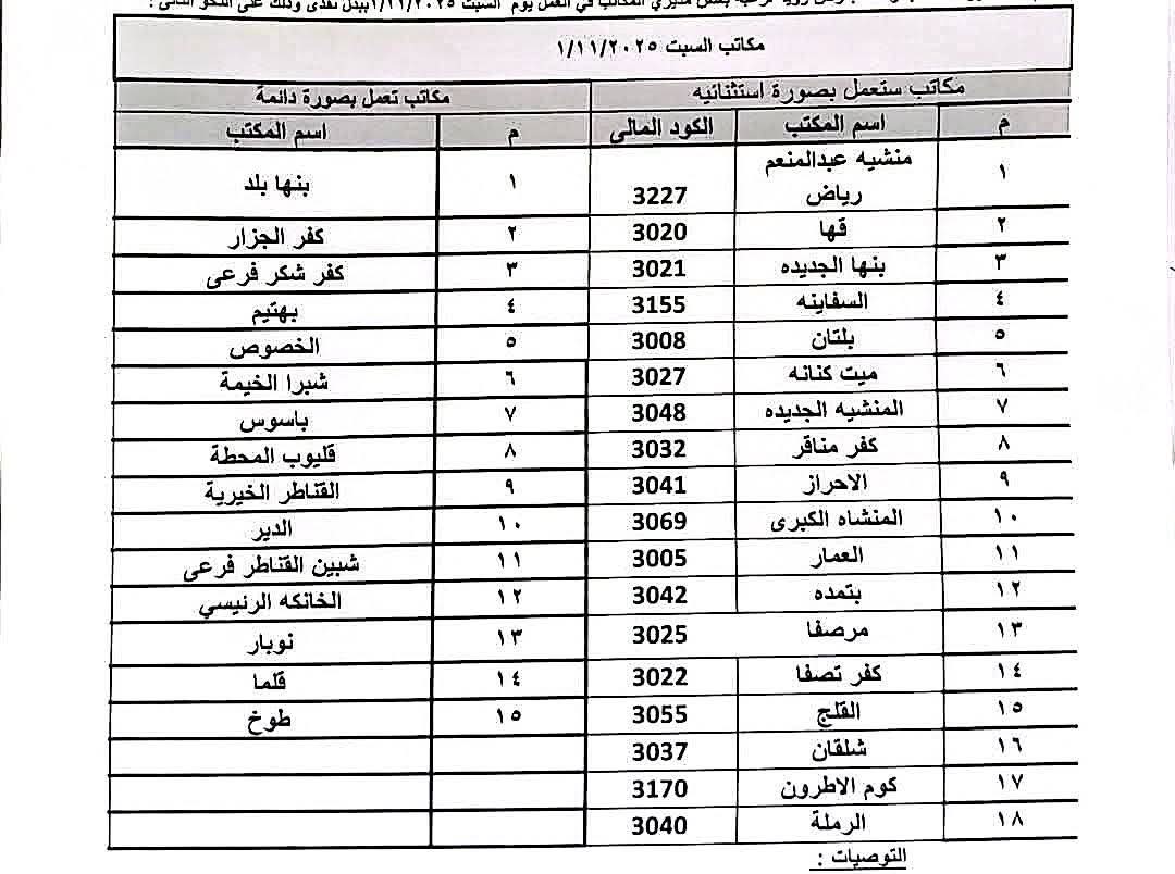 ومن بين المكاتب التي تعمل بصفة مستمرة يوم السبت داخل محافظة القليوبية ما يلي: