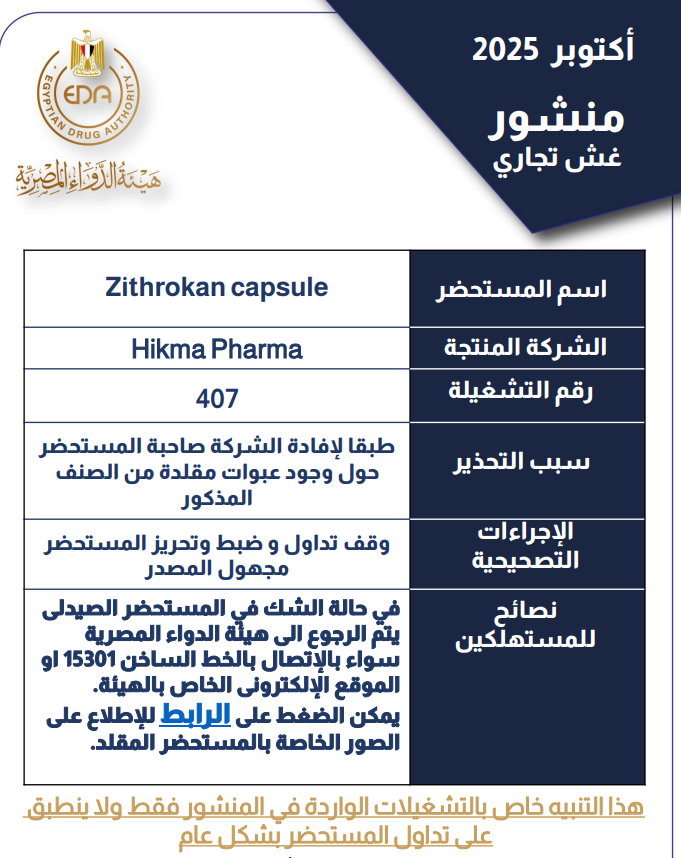 قررت هيئة الدواء المصرية وقف تداول وضبط وتحريز عبوات مقلدة من مستحضر «زيثروكان Zithrokan» كبسولات، الذي يُستخدم كمضاد حيوي في علاج التهابات الأذن الوسطى، واللوزتين، وعدوى الجهاز التنفسي العلوي، والتهابات الرئتين، وبعض أنواع العدوى المنقولة جنسيًا.