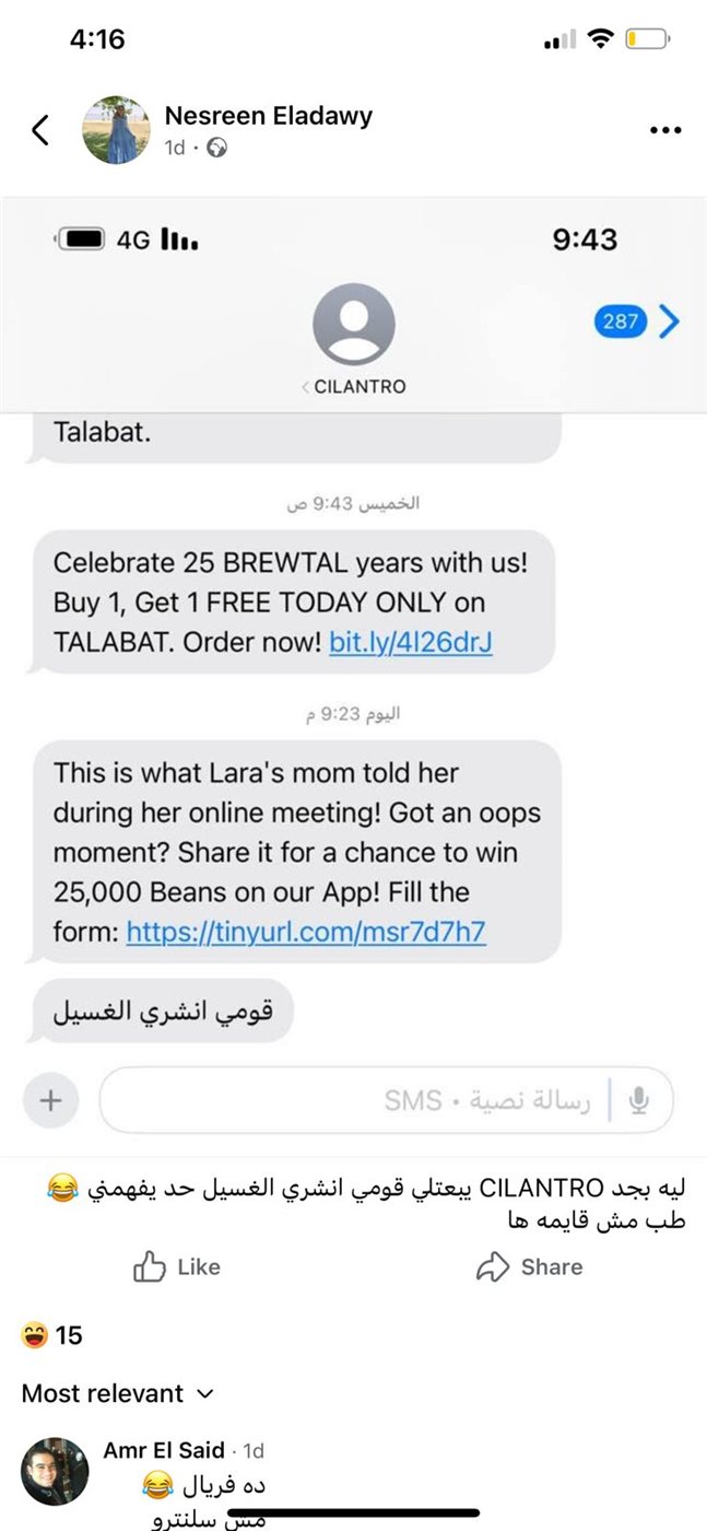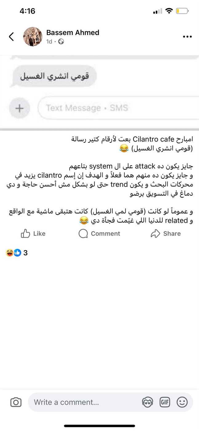 فقد فوجئ عدد من مستخدمي الهواتف المحمولة برسائل نصية غريبة تحمل عبارات مثل “قومي انشري الغسيل” و“اقفلي الكاميرا”، ليتبين لاحقًا أن مصدرها هو المقهى المعروف، في إطار حملة ترويجية جديدة اعتمدت على أسلوب المفاجأة لجذب الانتباه.