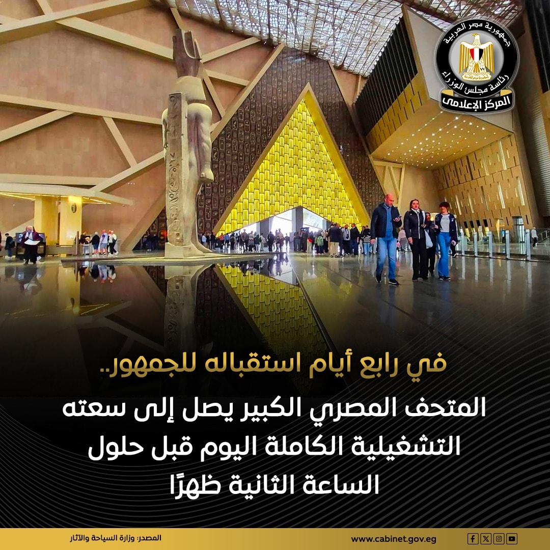 نشر المركز الإعلامي لمجلس الوزراء، انفوجرافًا سلط الضوء من خلاله على وصول المتحف المصري الكبير، إلى سعته التشغيلية الكاملة اليوم قبل حلول الساعة الثانية ظهرًا.