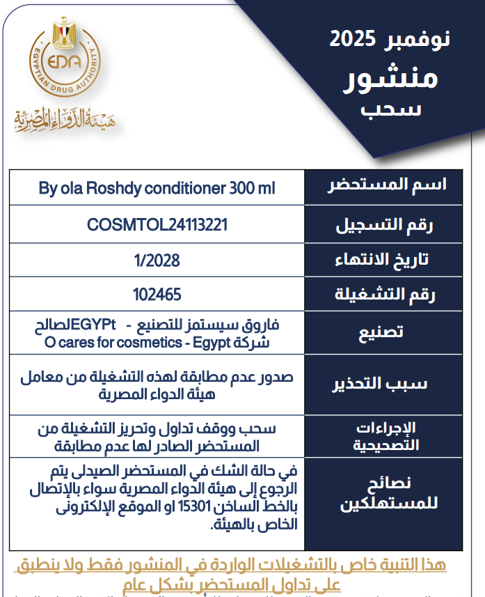 أعلنت هيئة الدواء، سحب وتحريز تشغيلة محددة من مستحضر التجميل "By Ola Roshdy Conditioner 300ml"، بعد أن أظهرت الفحوص معملية بعدم مطابقتها للمواصفات القياسية المعتمدة.