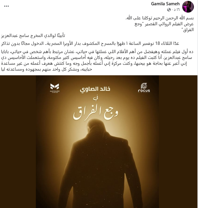 ونشرت جميلة ابنة سامح عبد العزيز صورة بوستر الفيلم، عبر حسابها الشخصي بموقع فيسبوك، وعلقت عليه: بسم الله الرحمن الرحيم توكلنا على الله.. عرض الفيلم الروائي القصير وجع الفراق، تأبينًا لوالدي المخرج سامح عبد العزيز، غدًا الثلاثاء 18 نوفمبر الساعة 1 ظهرًا بالمسرح المكشوف بدار الأوبرا المصرية.. الدخول مجانًا بدون تذاكر.