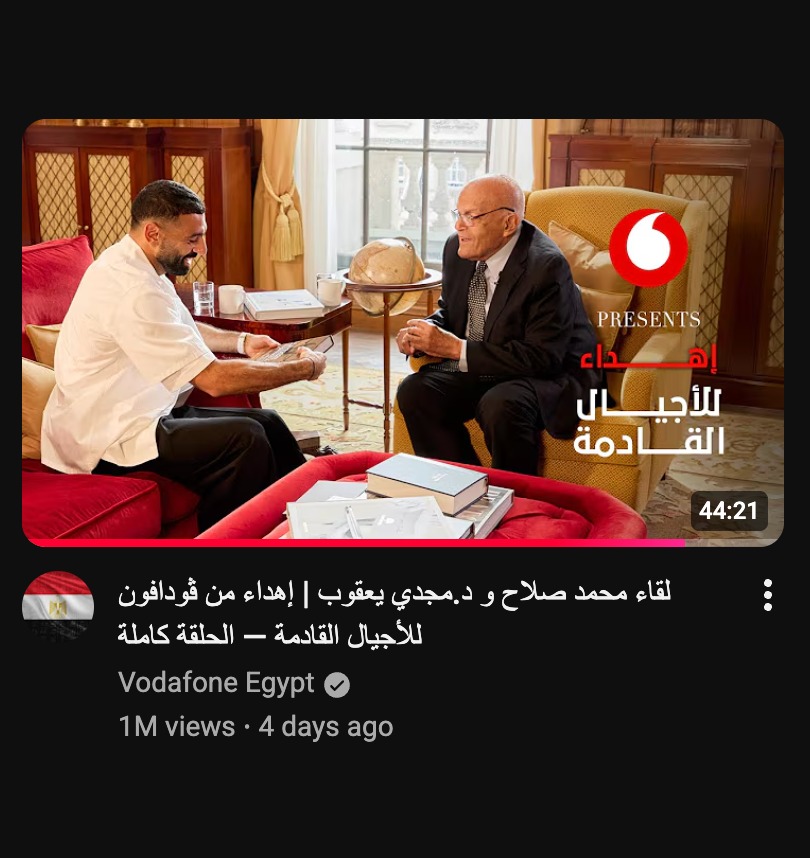 حقق حوار النجم المصري محمد صلاح، لاعب ليفربول ومنتخب مصر، وجراح القلب العالمي البروفيسور مجدي يعقوب، من ڤودافون مصر، مشاهدات تاريخية، في ظل الإقبال المتزايد على المقابلة الفريدة من نوعها، لتسجل المقابلة أكثر من مليون مشاهدة خلال 96 ساعة فقط على قناة ڤودافون على يوتيوب.