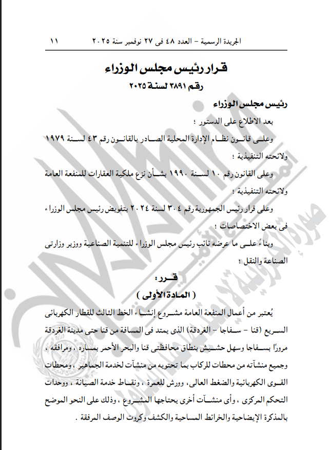 ونص القرار في المادة الأولى على أن يُعتبر من أعمال المنفعة العامة مشروع إنشاء الخط الثالث للقطار الكهربائي السريع (قنا - سفاجا - الغردقة) الذي يمتد في المسافة من قنا حتى مدينة الغردقة مرورا بسفاجا وسهل حشيش بنطاق محافظتي قنا والبحر الأحمر بمساره، ومرافقه، وجميع منشآته من محطات للركاب بما تحتويه من منشآت لخدمة الجماهير، ومحطات القوى الكهربائية والضغط العالي، وورش للعمرة، ونقاط خدمة الصيانة، ووحدات التحكم المركزي، وأي منشآت أخرى يحتاجها المشروع، وذلك على النحو الموضح بالمذكرة الإيضاحية والخرائط المساحية والكشف وكروت الوصف المرفقة.