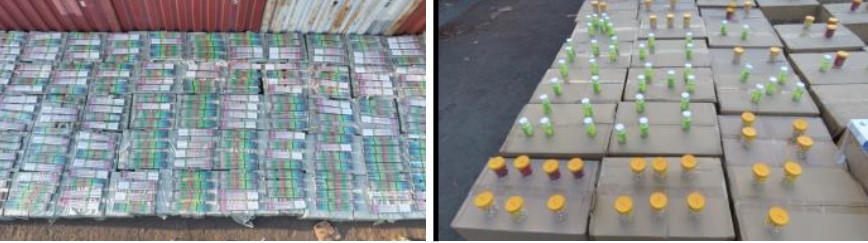 وعقب تقنين الإجراءات تنسيقا والجهات المعنية أمكن ضبطهما وأسفرت أعمال تفتيش الحاويتين عن ضبط أكثر من 186 ألف قطعة ألعاب نارية مختلفة الأحجام - 1400 جهاز اتصال لاسلكي – 4800 بطارية أجهزة اتصال - قرابة 2 مليون قرص لعقاقير طبية - 2800 قطعة غيار سيارات –9000 قطعة إسبراى منشط – 2400 جهاز صاعق كهربائي - 850 كاميرا لاسلكية صغيرة – أكثر من 121 ألف قطعة مستلزمات تجميل.