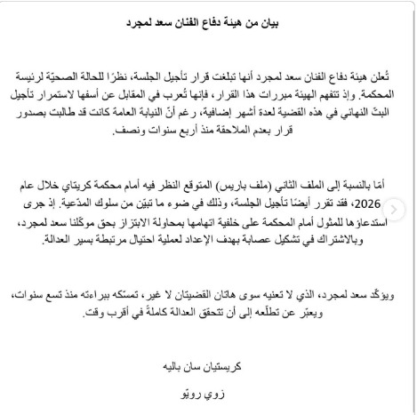 وأضاف البيان: أما بالنسبة إلى الملف الثاني الخاص بباريس فمن المتوقع النظر فيه أمام محكمة كريتاي خلال عام 2026، فقد تقرر أيضا تأجيل الجلسة، وذلك في ضوء ما تبين من سلوك المدعية، إذ جرى استدعاؤها للمثول أمام المحكمة على خلفية اتهامها بمحاولة الابتزاز بحق موكلنا سعد لمجرد وبالاشتراك في تشكيل عصابة بهدف الإعداد لعملية احتيال مرتبطة بسير العدالة.