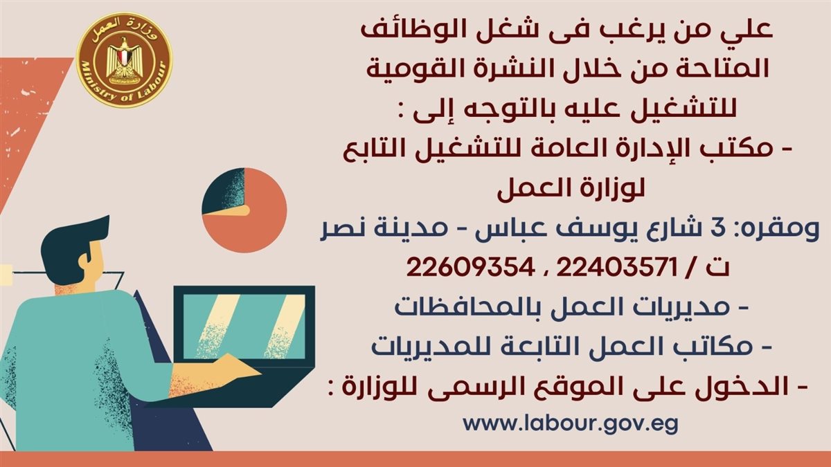 وأشارت الوزارة إلى أن نشرة التوظيف نصف الشهرية تُصدر بانتظام كل 15 يومًا من خلال الإدارة العامة للتشغيل برئاسة هبة أحمد، وإعداد منى شوقي، باحث أول بالإدارة، وتتضمن أحدث فرص العمل المتاحة في المحافظات..وأكدت الوزارة أن النشرة تتضمن مجموعة من الوظائف المخصصة لذوي الهمم، تنفيذًا لأحكام القانون رقم 10 لسنة 2018 بشأن حقوق الأشخاص ذوي الإعاقة، الذي يُلزم المنشآت بتخصيص نسبة 5% من إجمالي عمالها لهذه الفئة. ويأتي ذلك ضمن خطة الوزارة لحصر وتدريب وتشغيل ذوي الهمم ودمجهم في سوق العمل، تنفيذًا لتوجيهات فخامة الرئيس عبدالفتاح السيسي، رئيس الجمهورية، بتمكينهم اقتصاديًا ومجتمعيًا، وتوفير فرص عمل لائقة تُحقق لهم الدمج الكامل والمستدام.