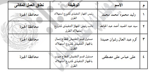 وجاء بنص القرار: يخول العاملون بالجهاز التنفيذي لمشروع استهلاك الطرق بمحافظة الجيزة الآتية أسماؤهم بصفاتهم الوظيفية -كل في دائرة اختصاصه- صفة مأموري الضبط القضائي، وذلك إعمالا لنص المادة (23) من قانون الإجراءات الجنائية، بالنسبة للجرائم التي تقع بالمخالفة لأحكام القانون رقم ٨٤ لسنة 1968 بشأن الطرق العامة، وهم: