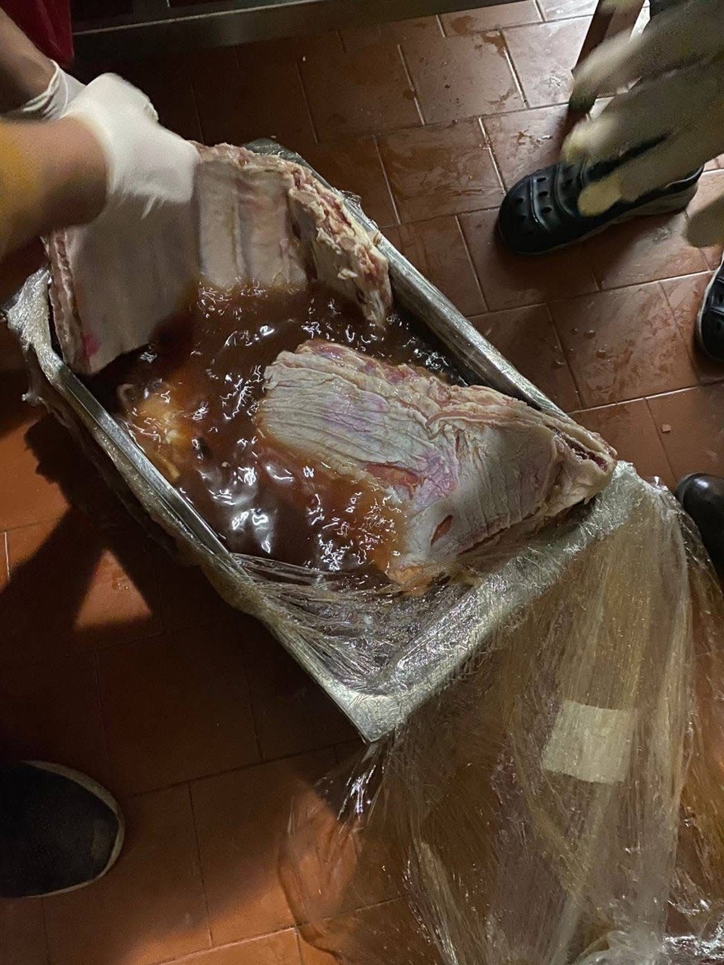 وخلال الحملة، تم ضبط كميات ضخمة من اللحوم والدواجن غير الصالحة للاستهلاك داخل مطعم شهير، شملت: 100 جردل شاورما دجاج وزن الجردل 19 كجم بإجمالي 1.9 طن، 3 سيخ شاورما دجاج وزن الواحد 120 كجم بإجمالي 360 كجم.